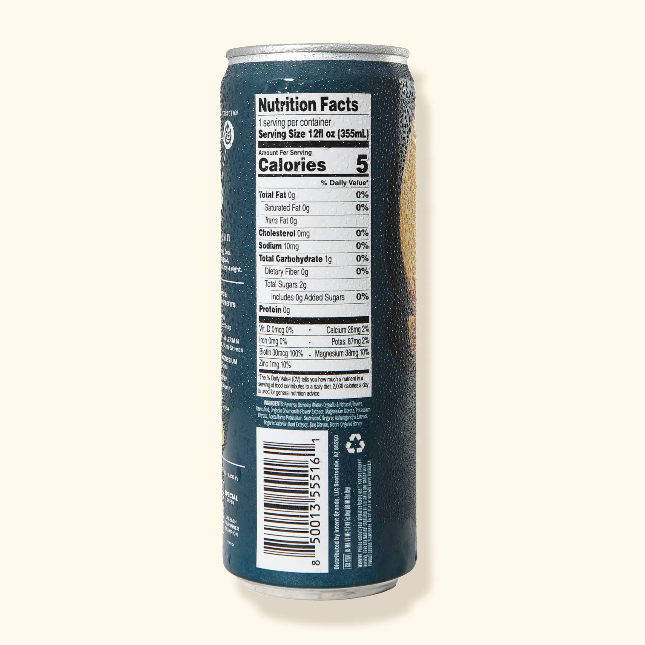 Filtered Water, Organic Honey, Organic & Natural Flavors, Citric Acid, Allulose, Organic Chamomile Flower Extract, Magnesium Citrate, Potassium Citrate, Stevia Extract, Organic Ashwagandha Extract, Organic Valerian Root Extract, Zinc Citrate, Biotin, Melatonin.